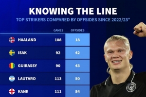 哈兰德——108场越位18次