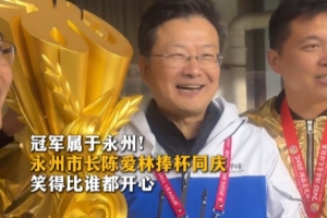 体育资讯12月28日讯 2025“湘超”决赛,永州队1-0击败常德队,夺得冠军。据“风芒新闻”报道,赛后永州市长陈爱林捧杯。