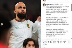 喀麦隆前锋姆伯莫社媒写道:“亲爱的喀麦隆民众,感谢你们在整个赛事期间给予的支持,你们的歌声和呐喊一直支撑着我们走到现在,尽管我们被淘汰了,但未来只会更好。”